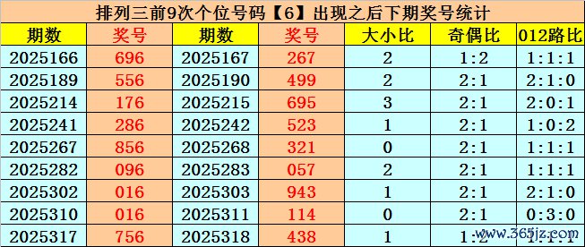 个位号码:上期奖号为大号、偶数、0路号码:6,历史上个位号码6共开出736期,前一次出咫尺第2025317期,上期遗漏7期再出。